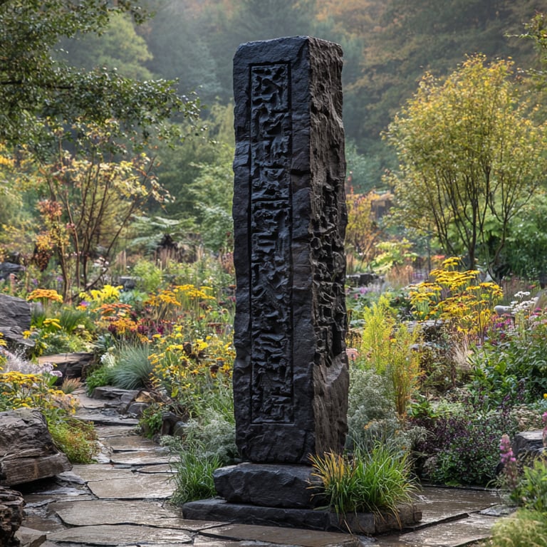 Monoliths, carved forms, or natural stone features that introduce weight and permanence.